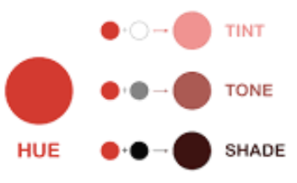 A tint is adding white, a shade is adding black and a tone has a different saturation.