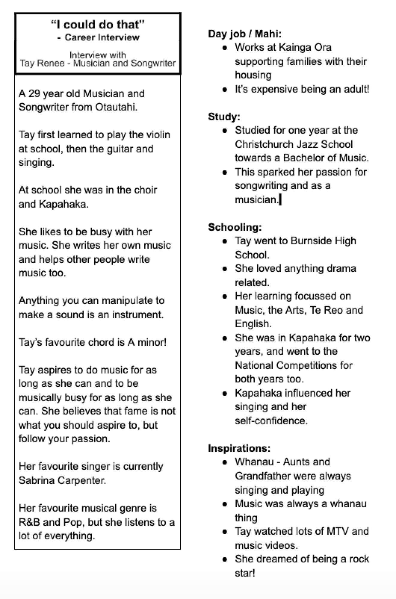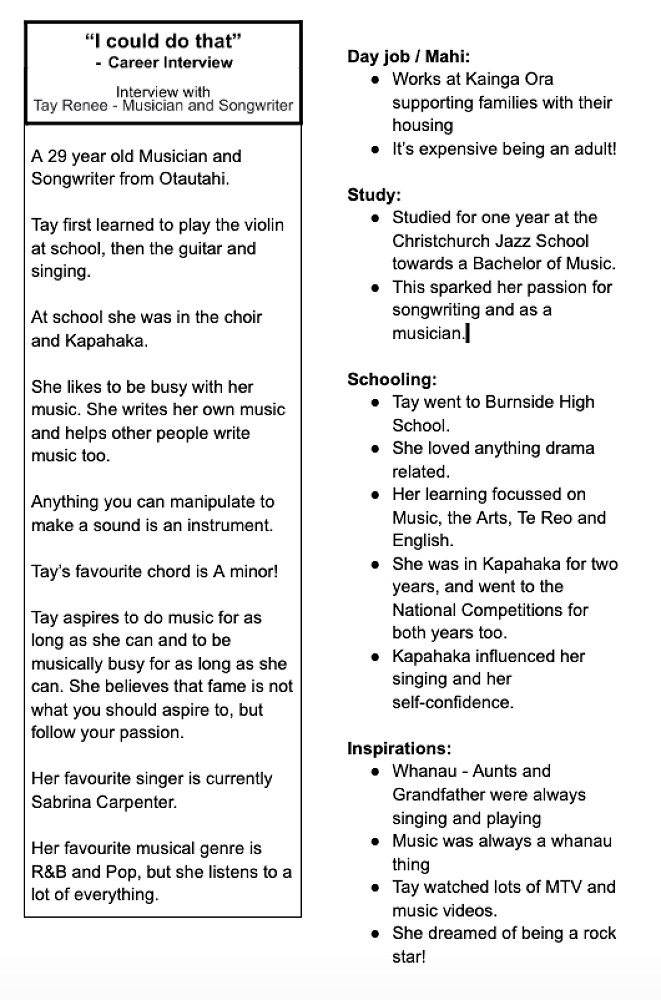 Tay Renee joined us on Tuesday afternoon as part of our Career series. Tay is a musician and song writer who answered questions from some of our Te Oraka students about what is involved with her career, the skills needed and offered advice to our budding musicians. Thanks for giving us your time, Tay!