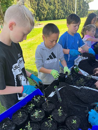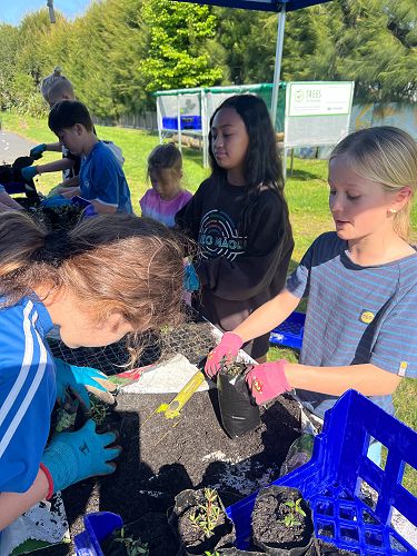 Facilitator and the students in Rm 12 to 'bag on' or 'pot up' 1000 native plant seedlings.