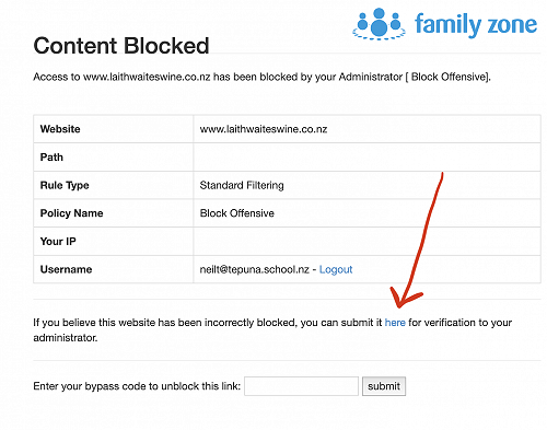 Occasionally the filters restrict legitimate pages too - so if this is something you experience, let us know. When a page is blocked, a message comes up giving the reason. There is a link to click to have the page reviewed and verified by an administrator. (see image below)