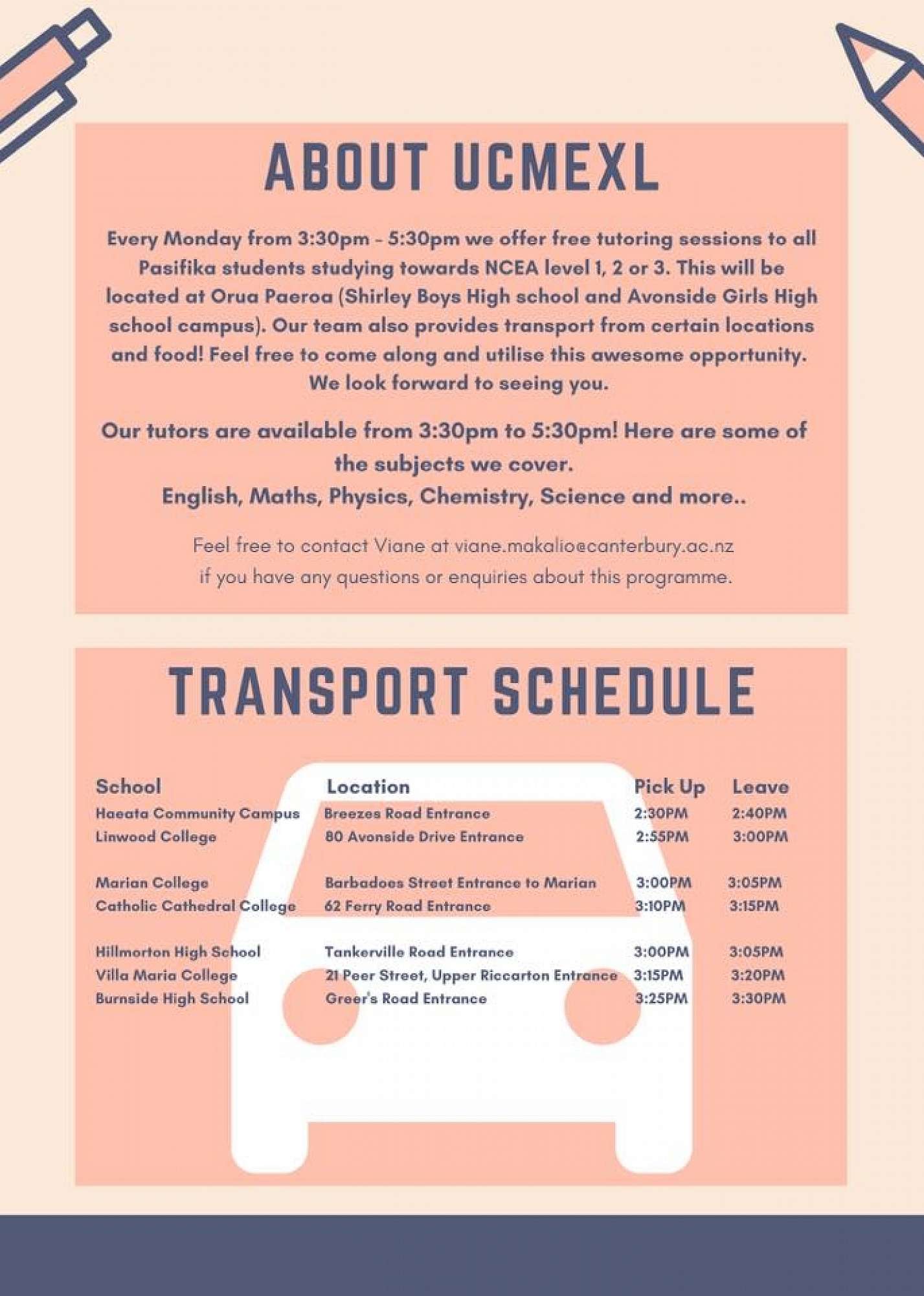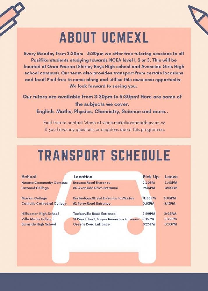 There are two weeks left of the Monday afternoon tutoring put together by the University of Canterbury, the Ministry of Education and Shirley Boys High School. This is for students studying at NCEA levels 1, 2 & 3. Please see attached information, and let Emma know if transport is an issue.