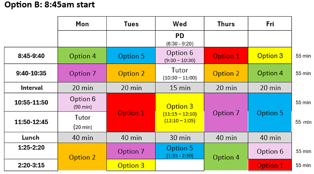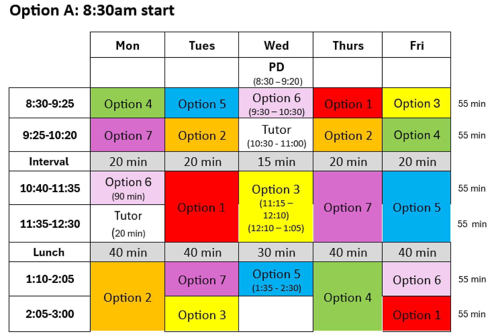 Two similar timetable structures are proposed here – one with an 8:30am start and 3pm finish, and the other the same in structure but with an 8:45am start and a 3:15pm finish.