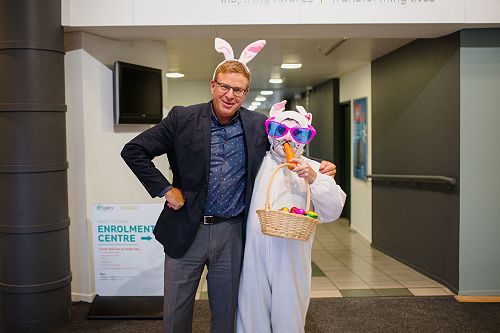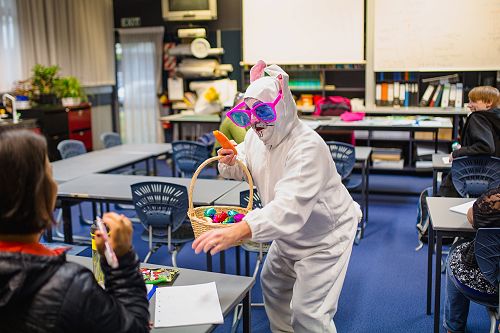 It's become a bit of a tradition each Easter for a Hagley staff member to pop on some bunny ears and hop around the school delivering chocolate eggs.