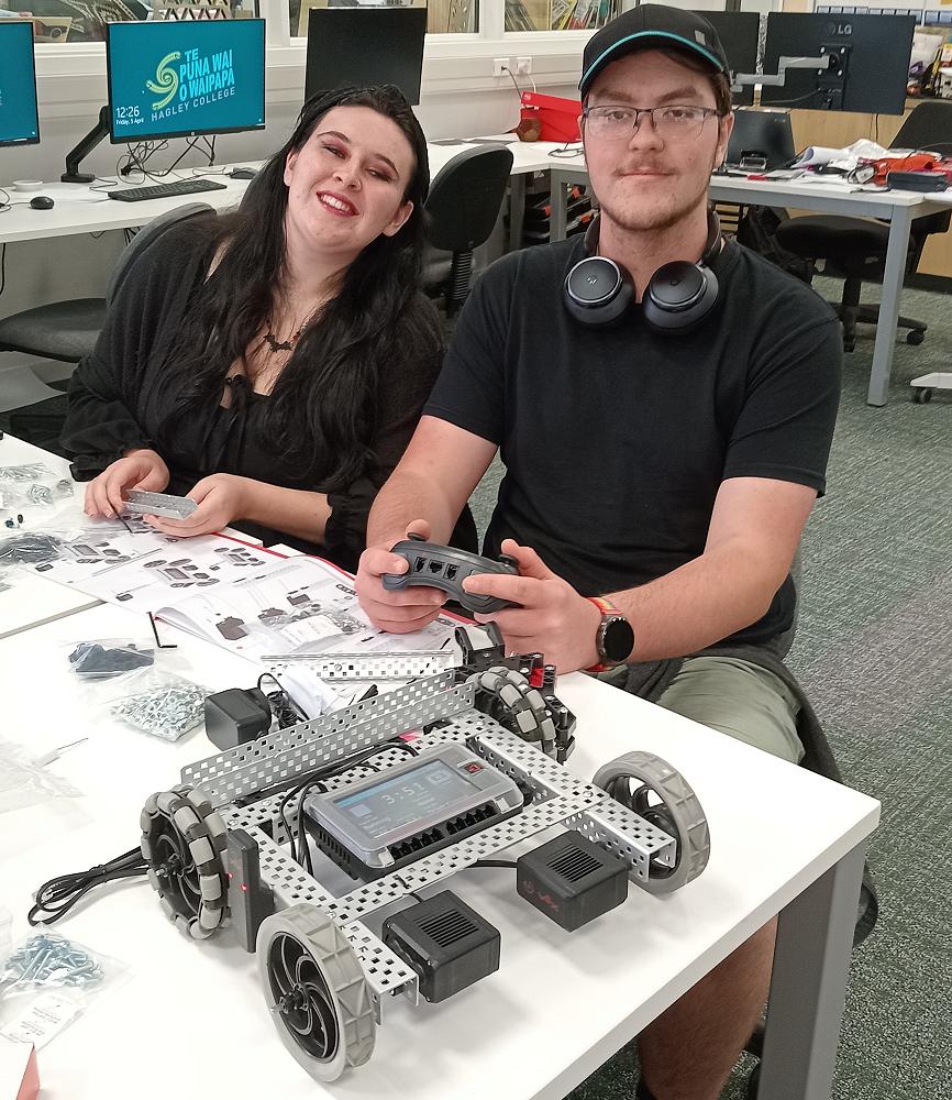 Isabella Rillstone and Hadley Kibblewhite constructing a VEX robot. The robot will be used to experiment with robotics programming and enables students to enter VEX robotics competitions.