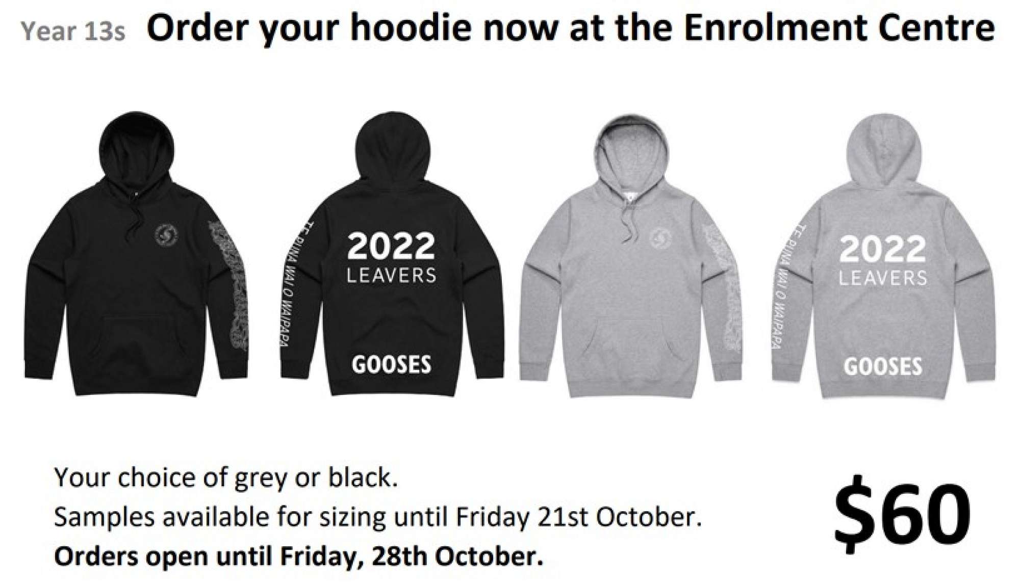 We also have the Year 13 leavers’ hoodies, soon to be available for purchase. A big thank you to Rosie, Pearce and Finn who have designed and organised the hoodies for this year. They will cost $60. Samples are available to try on at the Enrolment Centre.