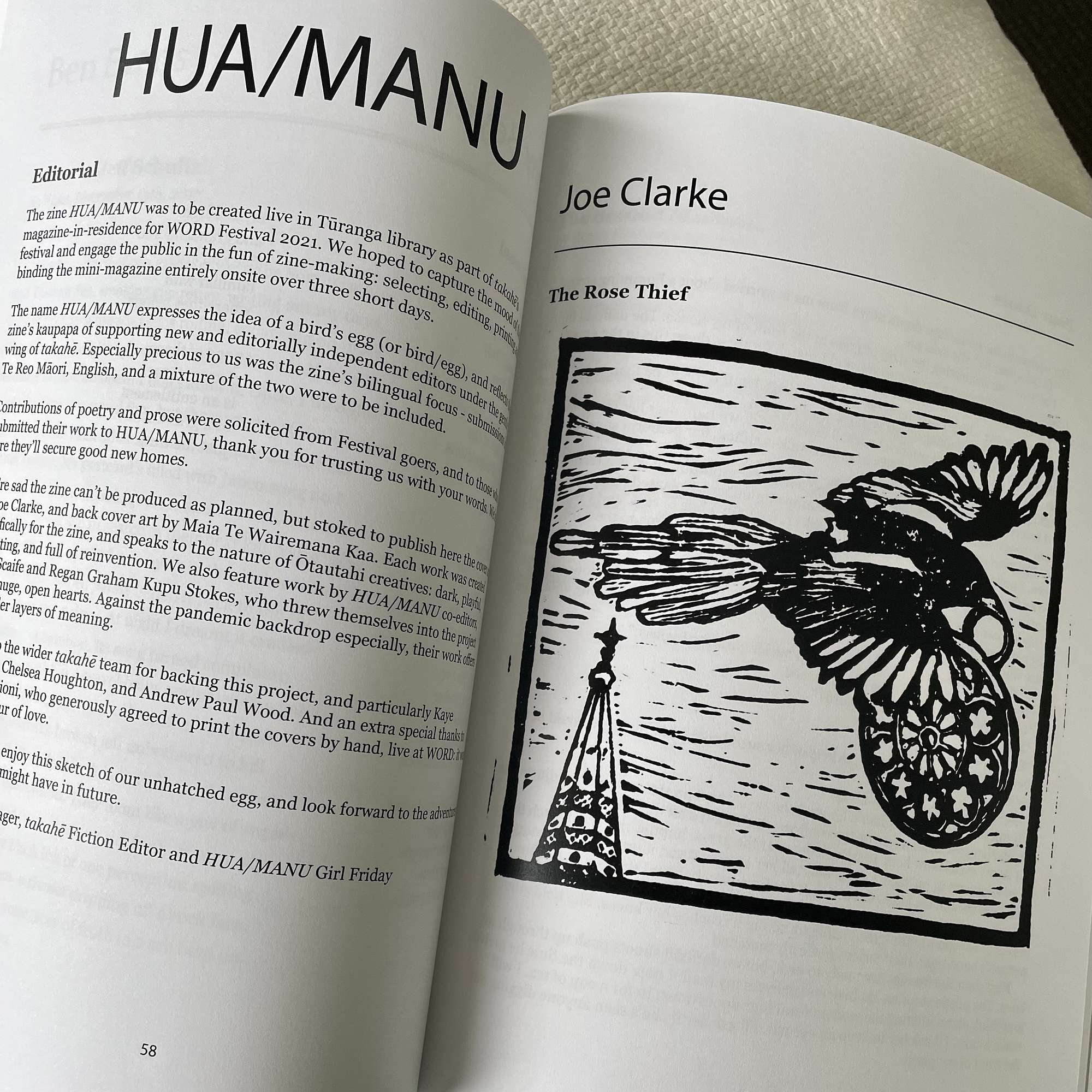 Another event that changed tack due to Covid was an innovative bilingual (Te Reo Māori/English) zine project, HUA/MANU, headed by two Hagley writers, graduate Regan Stokes (Ngāi Te Rangi, Ngāti Ingarangi) and current student Anna Scaife. The zine was to be edited and published live over 3 days of the WORD Festival, and included specially commissioned art by local artists, Maia Te Wairemana and Joe Clarke, with hand-printed covers by Peter Vangioni of Kōwhai Press. The project has been rescheduled for 2022, and a selection of art and writing from this year’s planned publication has instead been captured as a special feature in December’s takahē magazine.