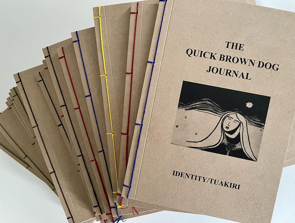 The fifth issue of the Hagley Writers’ literary journal, The Quick Brown Dog was launched in November. It’s the culmination of the mahi and dedication of its graduate editors, this year: Karen Clarke, Louise Lameko, and Eloise Pengelly, who chose the theme of Identity/Tuakiri. Eloise also contributed a koha of beautiful artwork created especially for the issue. The journal is an A5, 79 page, eco-printed and hand-bound publication, with a limited print run of 100. Contributors include Michalia Arathimos, Laura Borrowdale, Marisa Cappetta, Jeni Curtis, Doc Drumheller, Nod Ghosh, Jenna Heller, Gail Ingram, Teoti Jardine, Erik Kennedy, Marie McGuigan, James Norcliffe, Regan Stokes, and Toni Wi, along with many other established and emerging writers. Check our Facebook shop or email us for availability if you’re interested in purchasing a copy ($15). There’s also a small selection of work which is free to read online.