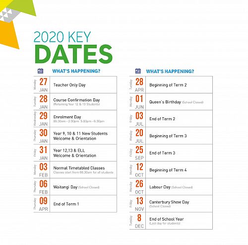 The Parent Portal is a great place to check the school calendar - click here to view the calendar. You can scroll through the months, and also scroll down for more information. You will also find the 2020 Key Dates in the graphic below.