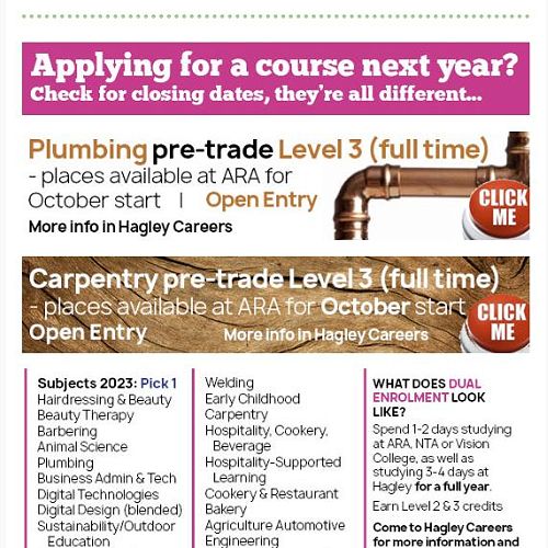 Visit this articleThere are a wide variety of courses and interesting sessions available for students in Years 9 to 13 to explore. Pop in to Careers today!