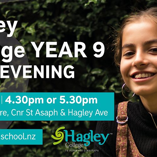 Visit this articleOur Year 9 Open Evening for prospective 2022 Year 9 students, their parents and whānau is on Thursday 27 May, 4.30-6.30 pm beginning in the Hagley College Cafe (corner Hagley Ave and St Asaph Street).