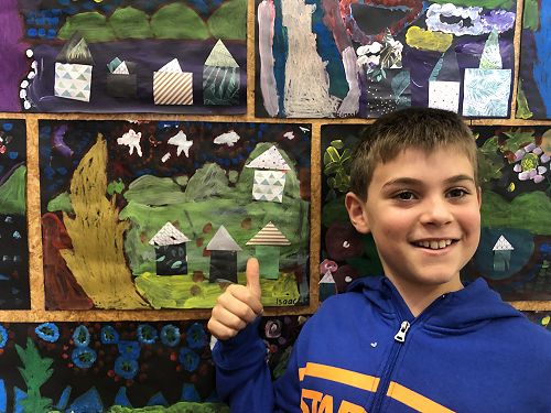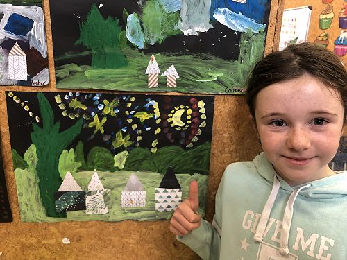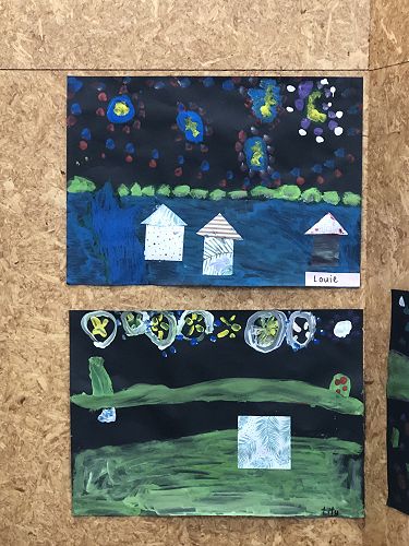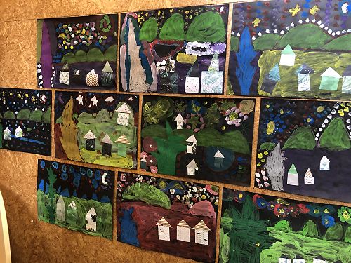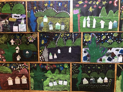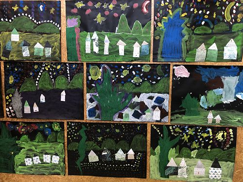 Pukeko tamariki have engaged in an arts interchange. During this, some tamariki created incredible pieces of work inspired by Vincent van Gogh's Starry Night. They learnt about foreground, midground and background, mixed colours and used mixed media to layer images over plain similar colour tones. They look amazing. Pearl really enjoyed mixing the colours and liked how her work had lots of different greens on it. Isaac loved painting. He placed some houses on the hills and flat land at the front.