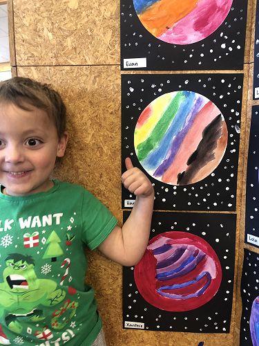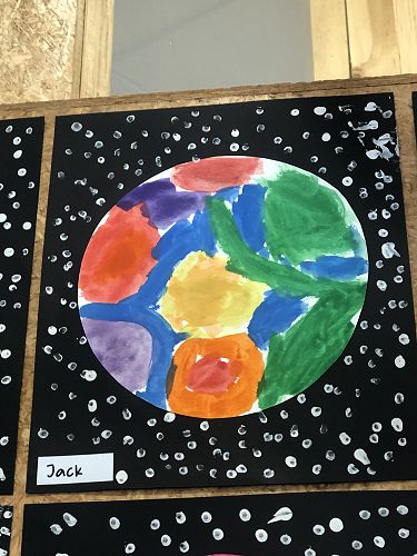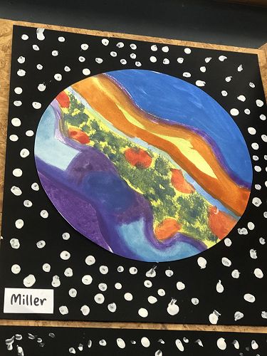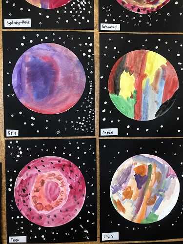 Other tamariki in the Pukeko hub developed some interesting planets that are illuminated by bright shining stars. I loved some of their visual interpretations of Earth from afar. For example, Juane painted a rainbow on planet Earth. Jack used green for water, and Miller tried her hardest to make it look real. She included some incredible detail in her work which she said was covering some of her earlier mistakes. Harrison just thought the whole process was fun! Pukeko tamariki clearly enjoyed using inspiration from their inquiry learning and famous artists to develop their ideas.