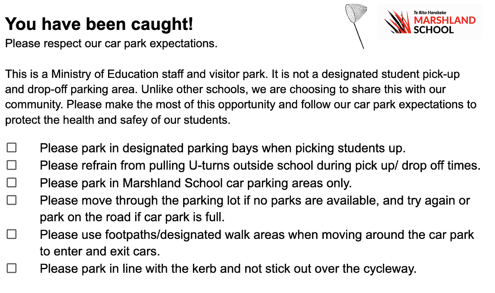A huge thank you to whānau who are parking appropriately and respecting car park signage. We really appreciate it.