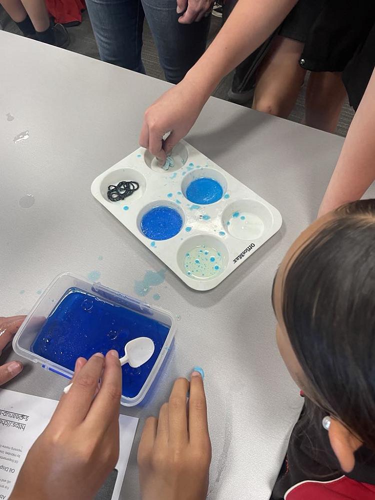 To get the students thinking deeper about oil spills, the students were then handed another experiment where they were challenged to clean up oil in water using a variety of tools to simulate actual techniques that are used such as skimming, absorbing, booms and dispersants.