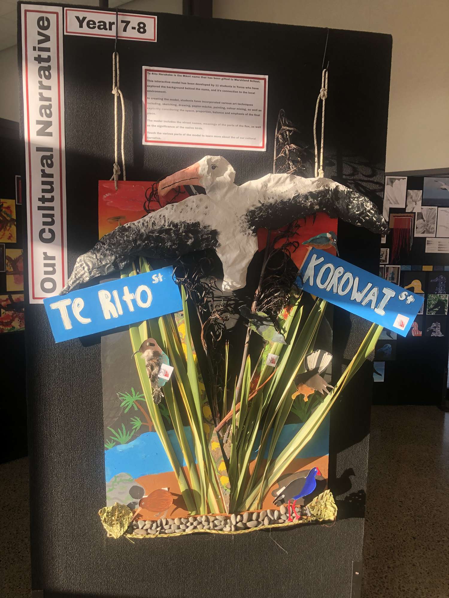 Our school developed a mural to depict our Cultural Narrative in 2024, with funding provided through the Creatives in Schools Project. This involved Year 1-8 students learning about our cultural narrative and creating art to depict the distinct flora, fauna and native bird feathers that have significant to the school's local environment and name - Te Rito Harakeke. Following this, 20 Year 7-8 students were identified to work with two mural artists, Nick Lowry and Reuben Woods to create mural panels.