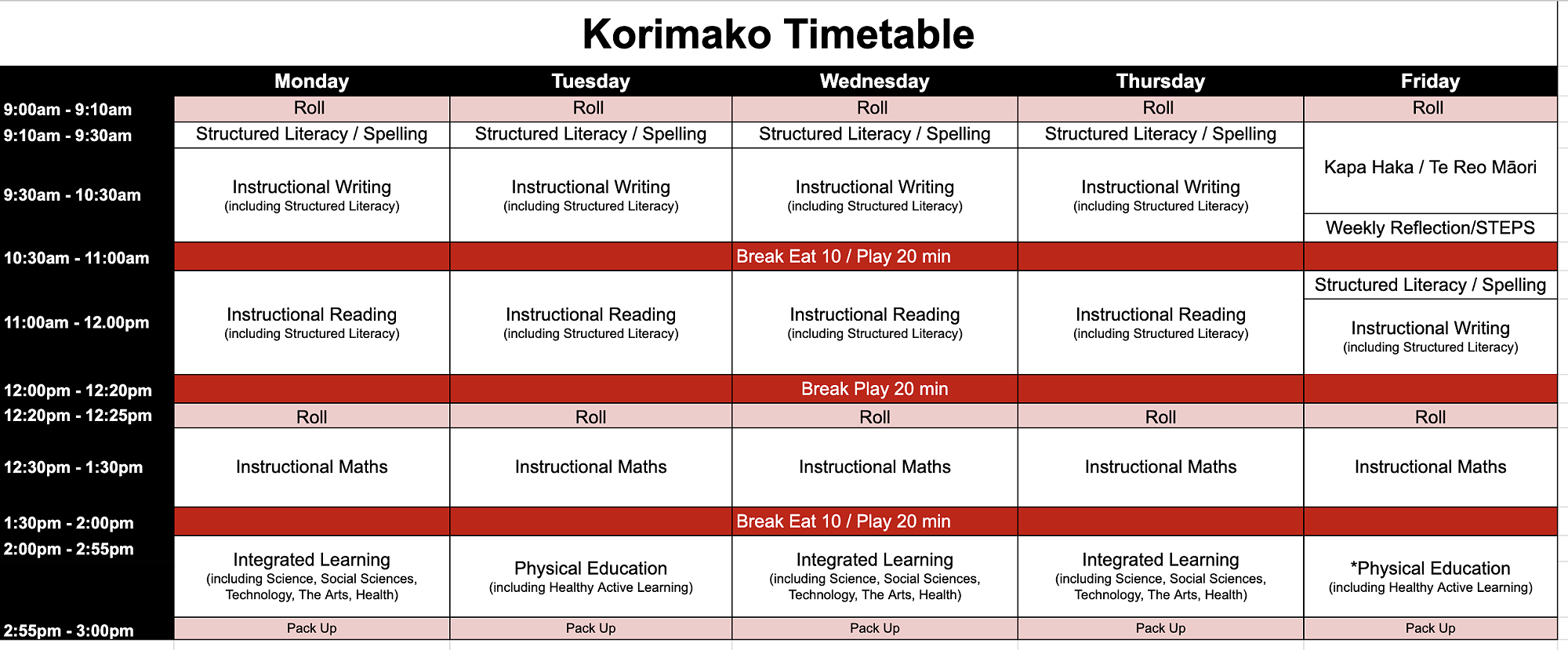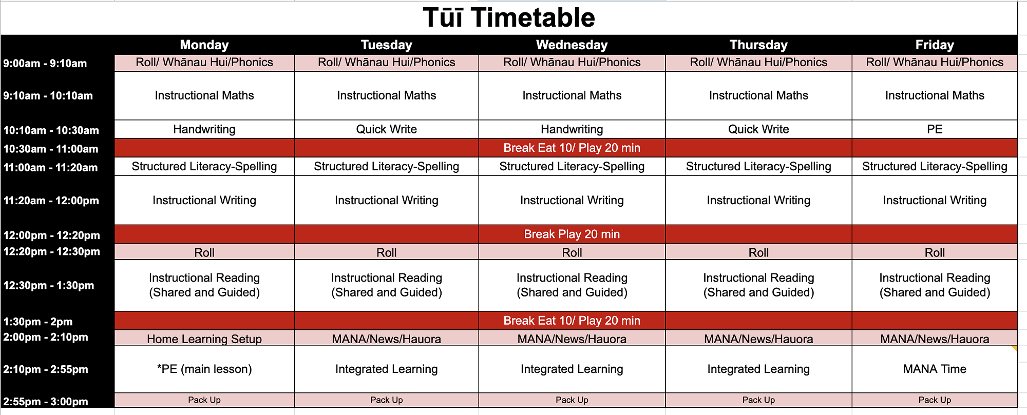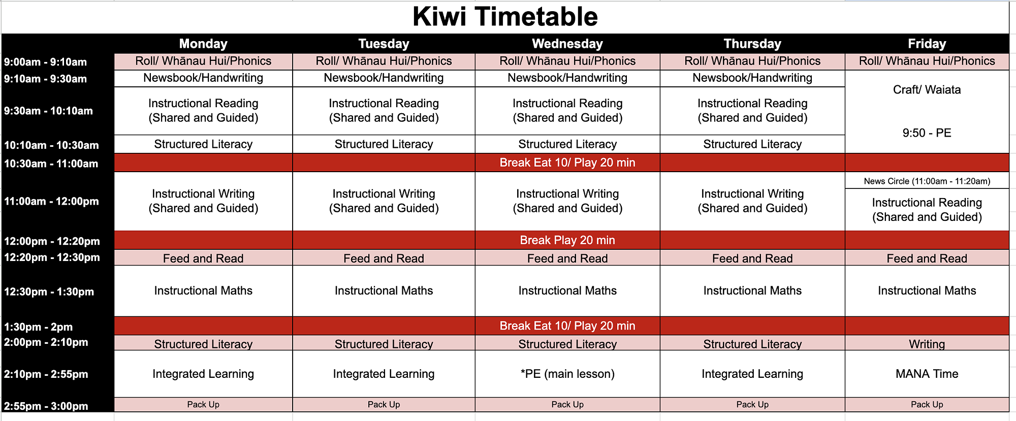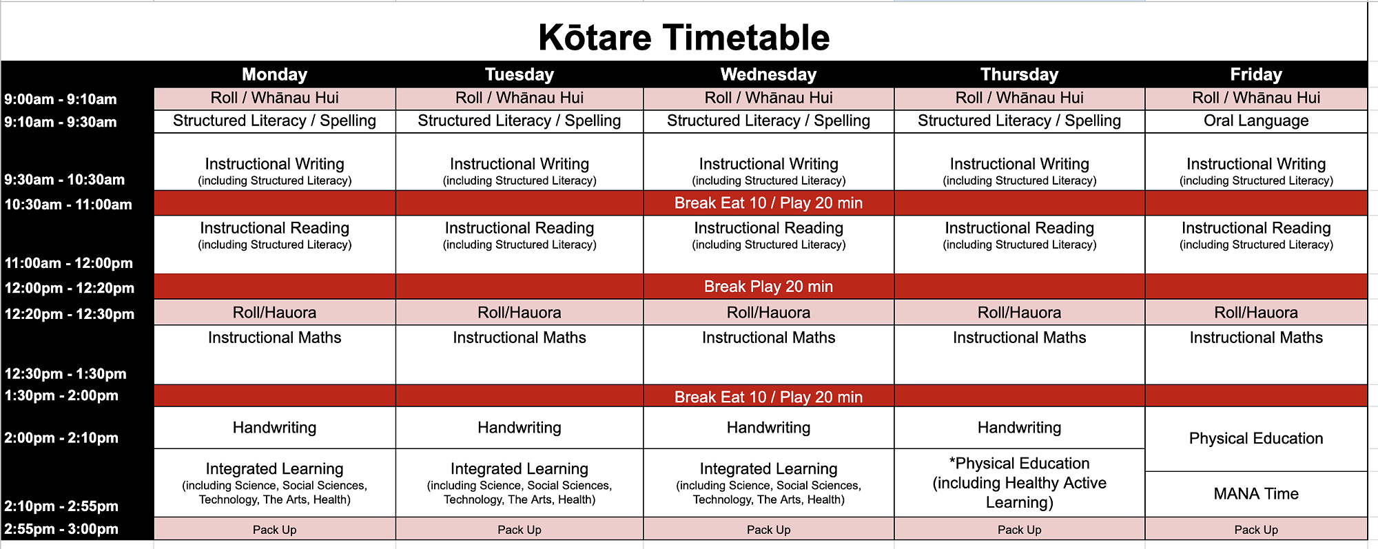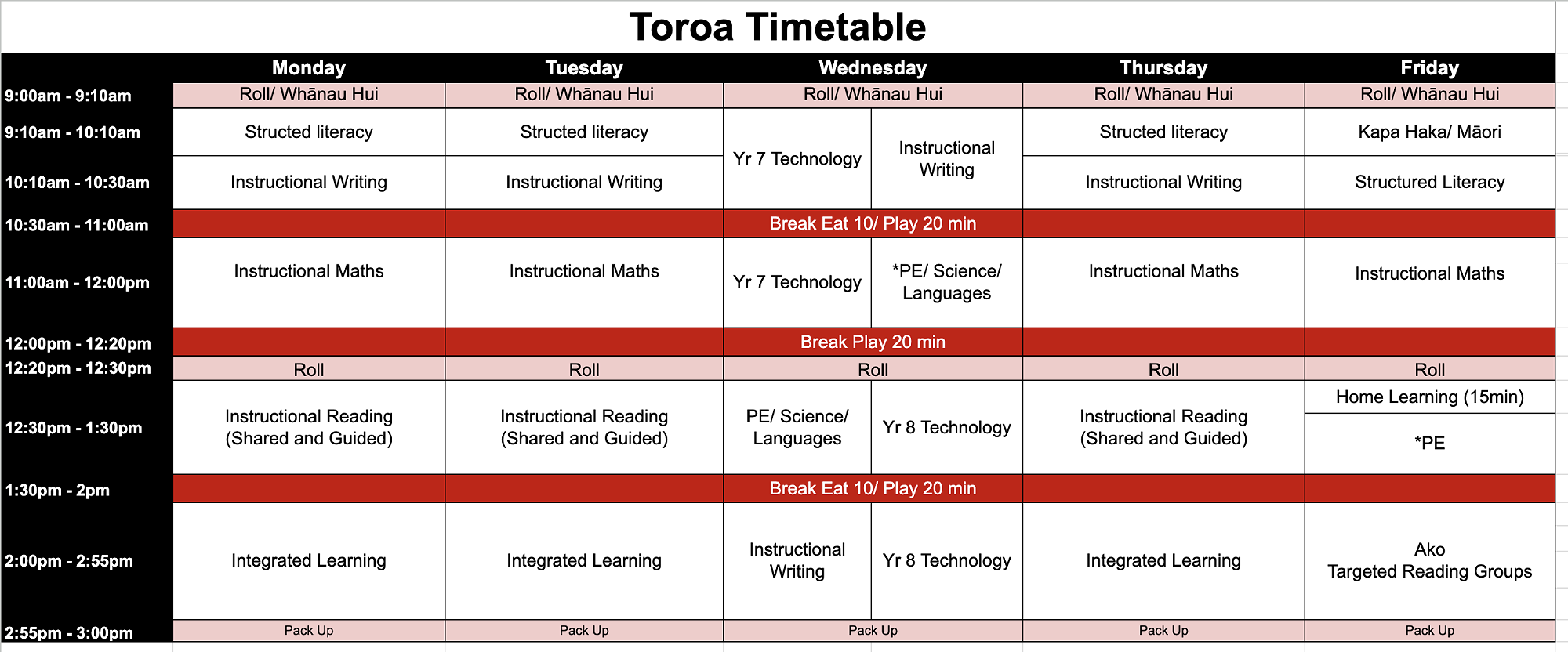 Please see below the weekly timetable for each hub at Te Rito Harakeke - Marshland School. This is a guide only and may change due to different events throughout the school.