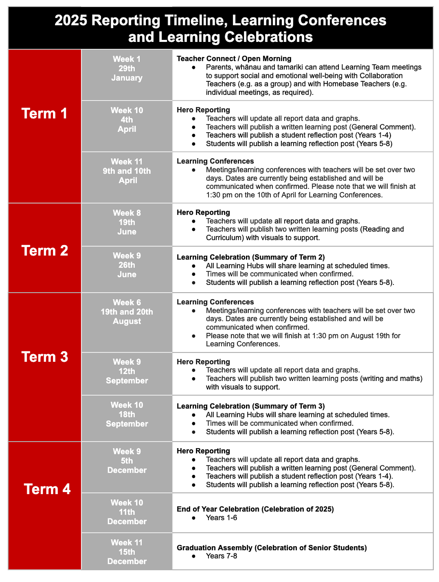 REPORTING AND LEARNING CONFERENCE TIMELINE - You will receive an updated progress report at the end of each term, indicating where your child sits in relation to curriculum-level expectations for their age. This will also include a bar graph to show student progress over time. A different learning post or general comment will be included each Term. Details of these are outlined below.