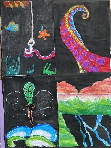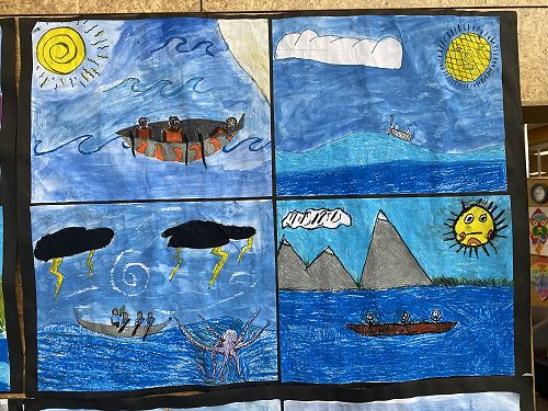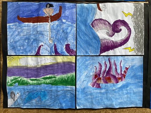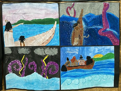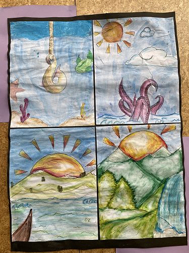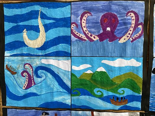 Students worked in groups of 4 to design and create 4 separate images. These individual images were then put together as a storyboard to depict the story of Kupe and the Giant Octopus.