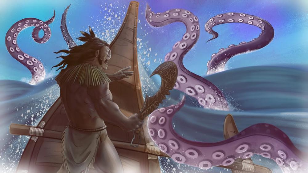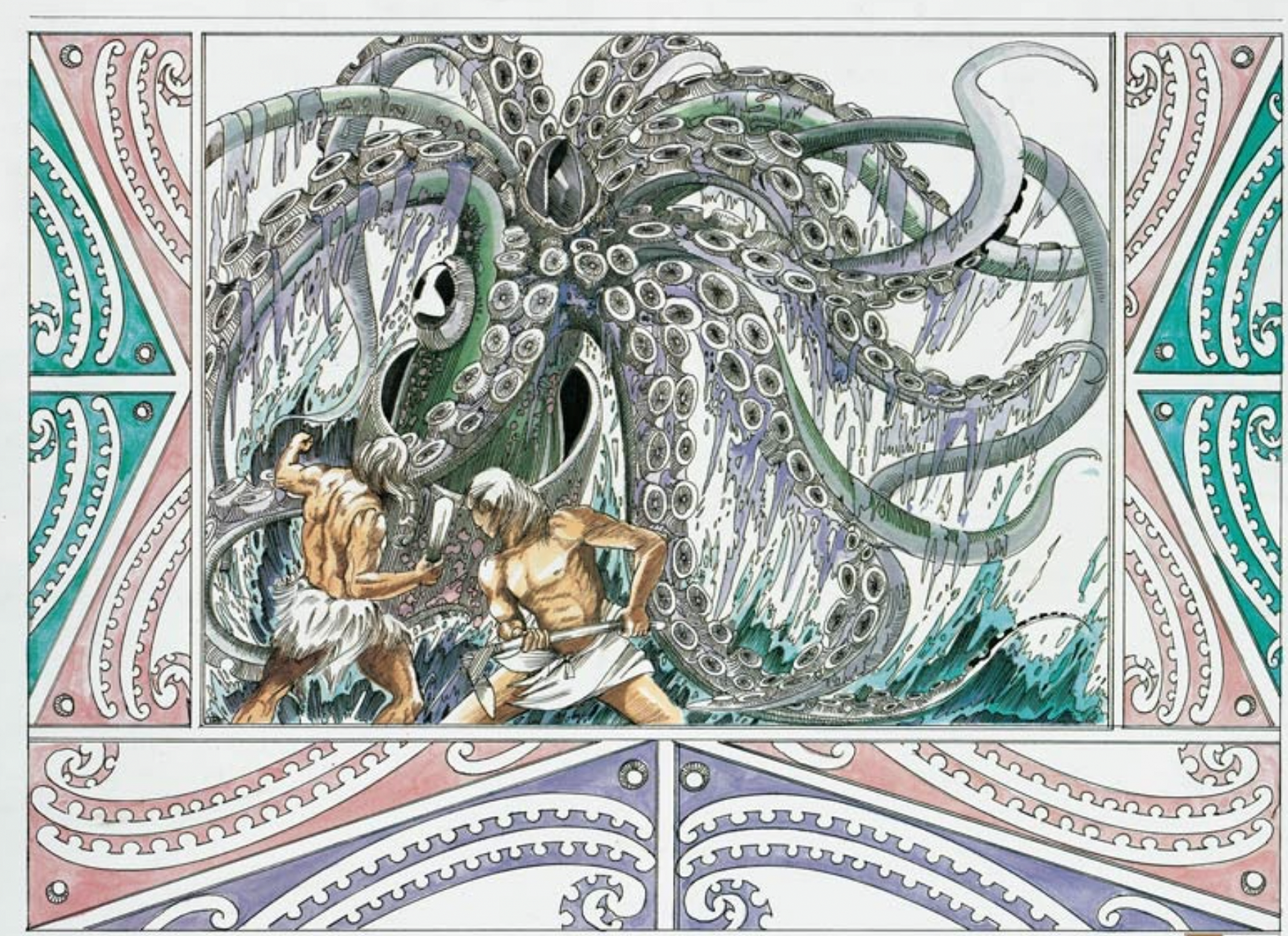 This video and this illustration by Cliff Whiting, was the inspiration for the student's artwork, showing the battle between Kupe and the giant octopus, Te Wheke a Muturangi.