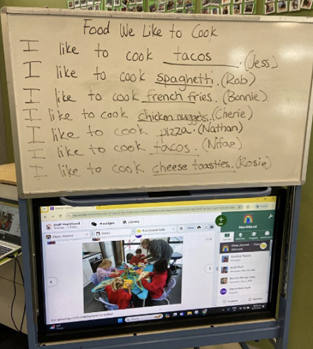 In Pīwakawaka we are using Predictable Chart Writing to help us learn that we are writers. We all take a turn using our AAC device to choose what we want to add to our sentence. This week we all wrote about food we like to cook, as we cook our own lunches once a week.