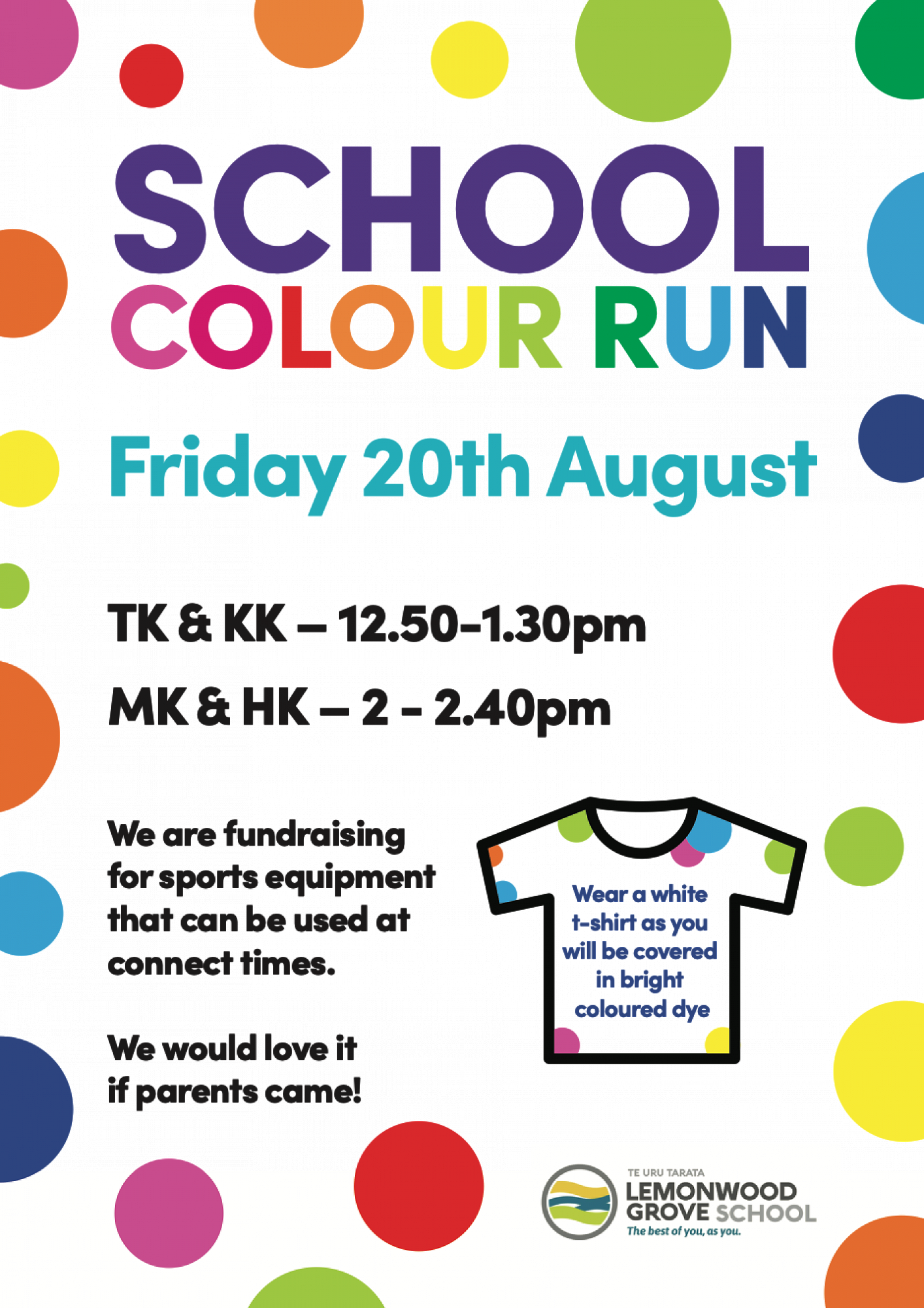 Just a reminder that on the afternoon of Friday 20th August we will be holding a school fun run on the back field. There will be a variety of obstacles, as well as coloured dye which will be thrown as the children are running and will make their T-shirts multicoloured, so make sure you wear a white T-shirt! You still have a few more weeks to raise as much money as you can for new sports equipment for our Connect times. The poster attached has all of the information that you need to know about the event. We look forward to seeing you all there!