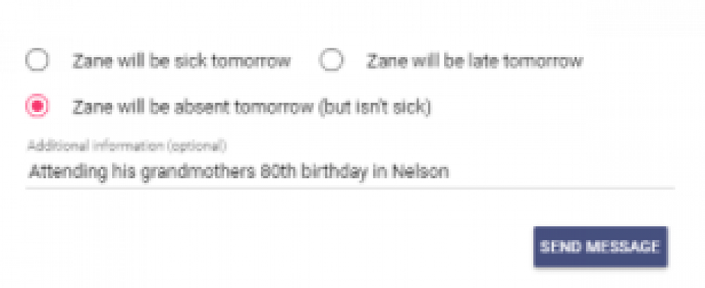 2. Please select the reason for the absence and provide the detail. The Additional Information is mandatory if you select '<name> will be absent tomorrow. This is to assist the administrator in determining the absent mark without having to phone the Caregiver.