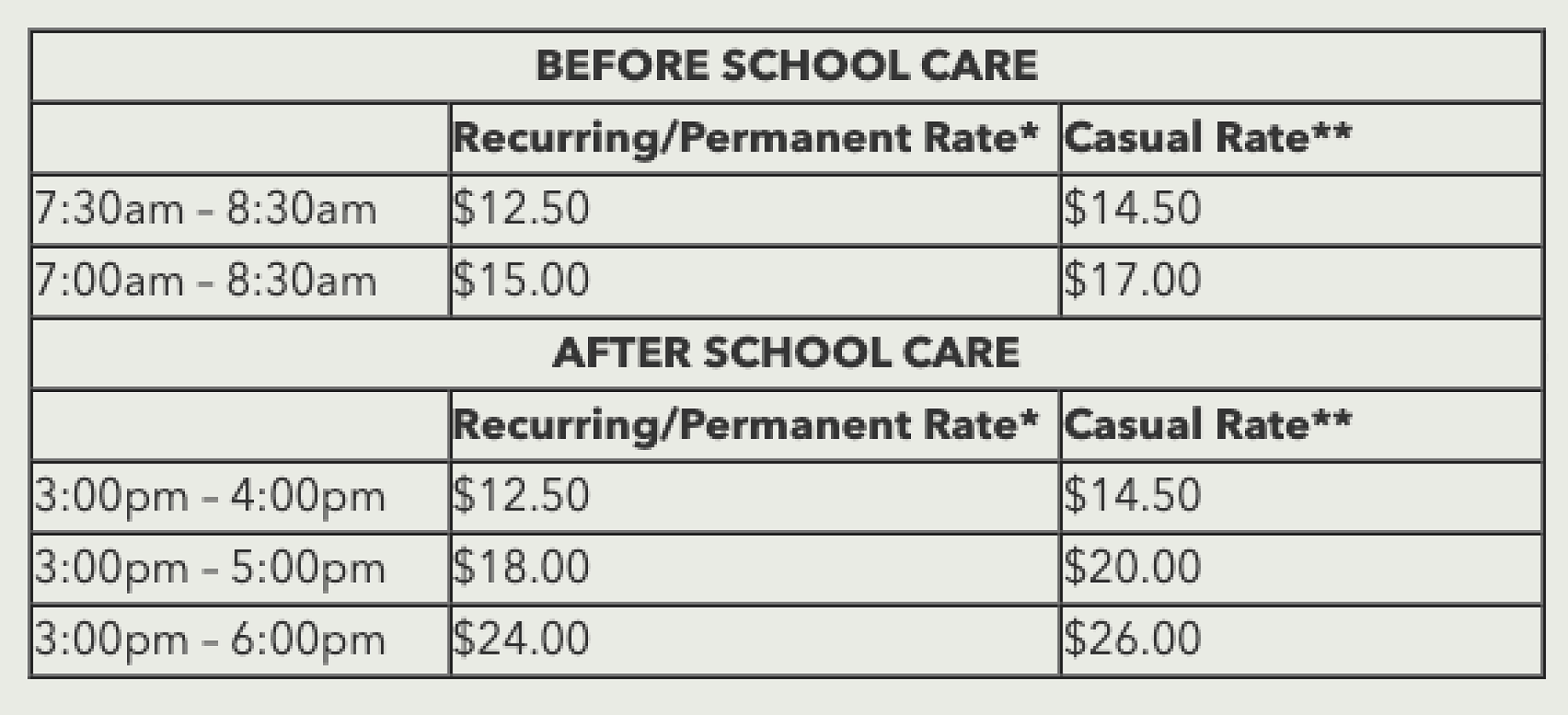 Our pricing for 2023 Before and After School Care and Holiday Programmes is as follows:
