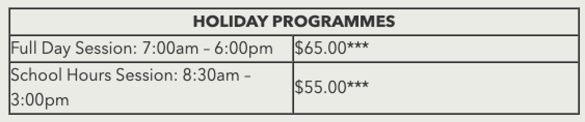 ***Please note, Holiday Programmes must be paid for in advance, immediately upon booking, and additional Excursion/Incursion costs may be applied on specified days.
