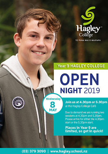 Please see poster below regarding their Open Night on Wednesday 8 May 2019 Or check out their website for more info: https://www.hagley.school.nz/enrolment/junior-college-enrolments/