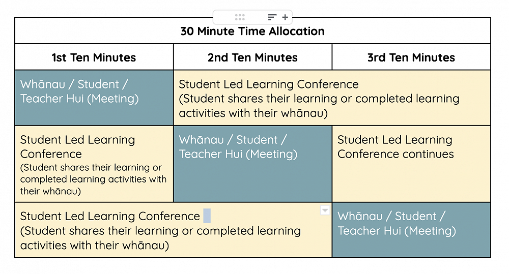 Please note 30 minutes per child, 10 minutes is a Hui with the teacher and 20 minutes is the student led learning conference.