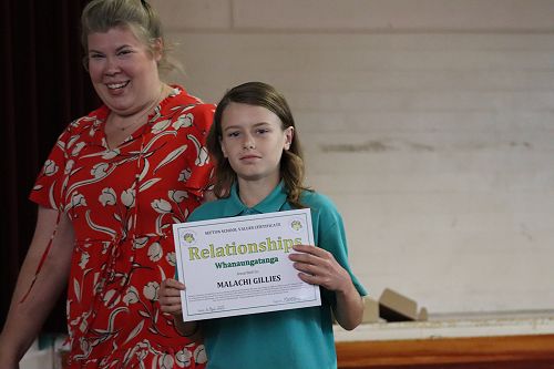 Malachi Gillies: Malachi, it has been wonderful to see you develop some great friendships this year and seeing you light up when you get to school is such a joy. You are voluntarily putting yourself into more leadership roles within the school through your Wheels Thursday idea and your dedication during buddy time with Room 6 and Ohanga. I am really proud of the leader you are becoming and the care with which you respond to others. It is for this reason that you are our Relationships - Whanaungatanga value recipient. Keep up the great work!
