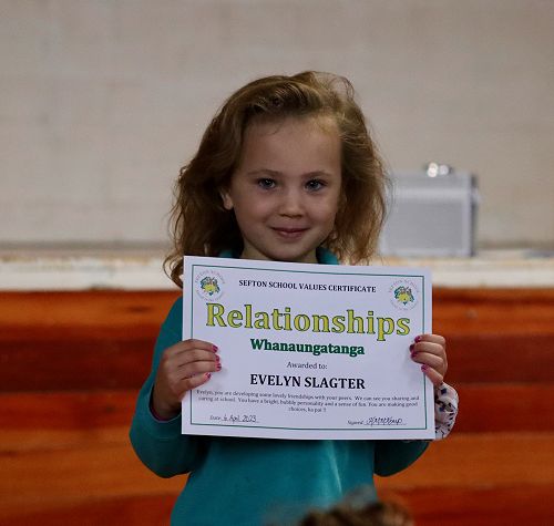 Shayla Hollands: Shayla, you show that you can handle challenges and changes with Resilience - Manawaroa. You made the transition to Room 6 with ease. You have done it all with a smile and positive attitude. You are learning the new routines and making new friends. We are lucky to have you at Sefton. Miiharo !!