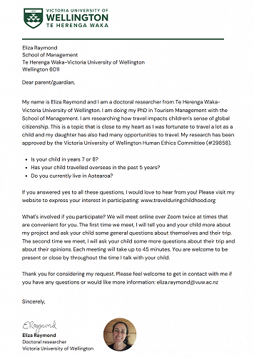 Research approach: I am interviewing tamariki who are in years 7 or 8 and have travelled overseas in the past 5 years. I will be interviewing children online over Zoom. I will schedule interviews directly with families at a time that suits them (e.g. after school or during weekends). My research has been approved by the ethics committee of Te Herenga Waka—Victoria University of Wellington (#29858).