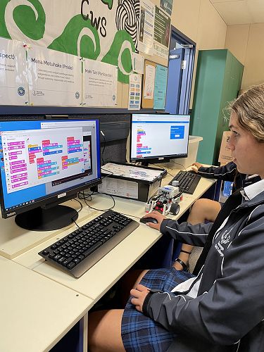 Students work in pairs to build the driving base and then through a series of activities focused on developing their programming skills. So far they have learnt to program the robot to carry out different maneuvers, detect an object and pick it up using an ultrasonic sensor, follow a line along a path and change direction at specific angles.