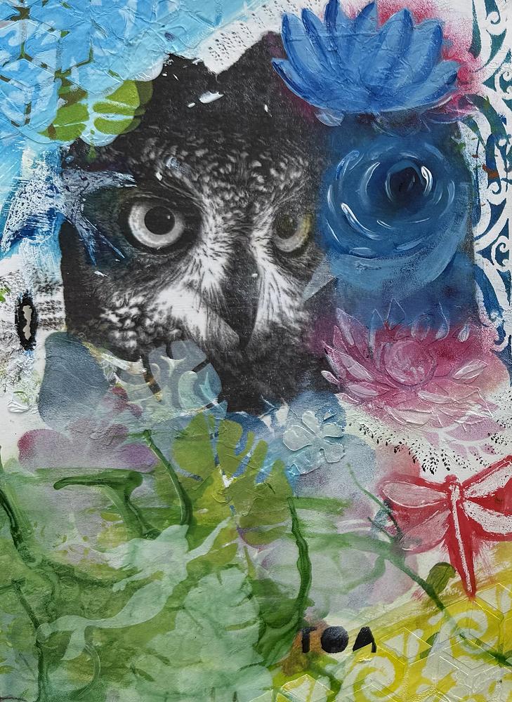 I enjoyed making my first multimedia artwork. We had learnt a lot of different art techniques, and I tried to use as many as I could in this painting. I did some modelling paste stencils of flowers, leaves, and a Dragonfly. Then I painted fine detail on them. I also used crayon and dye on the Dragonfly. I love trying out new colours to make it interesting.