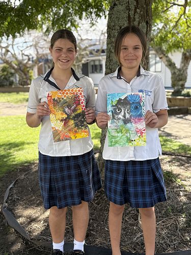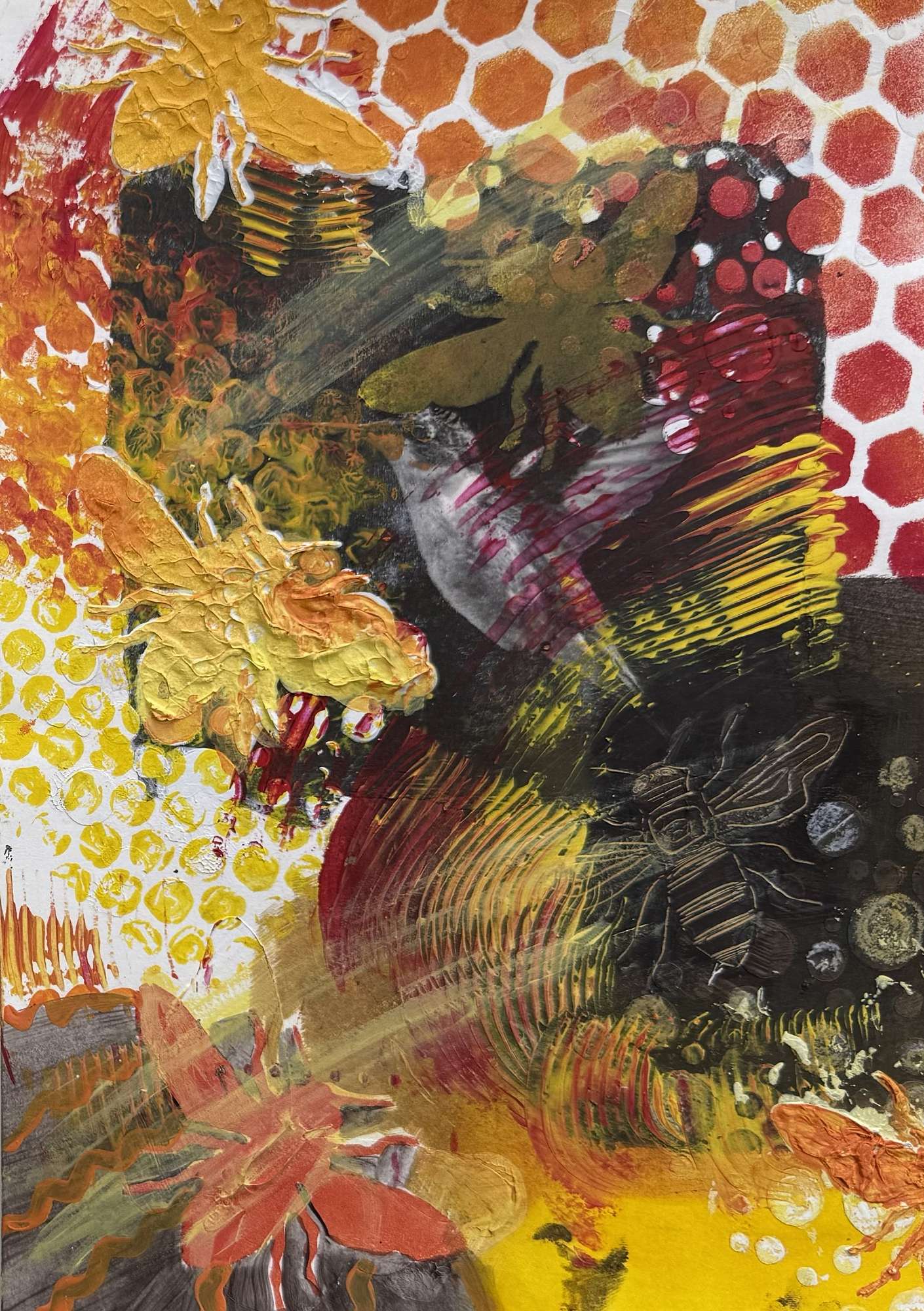 I am Juanita van Pareen in Year 9 Art. We have been focusing on different painting techniques and creating a piece of art that includes all the techniques. I painted the bee layered art using stencils, sponges, and scrapers. I used different techniques, including sgraffito, layered stencils, and modeling paste. I really enjoyed being able to make a piece of art without having to stress out over perfection. I loved being able to go wild and do what I wanted to.
