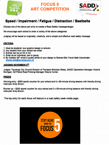 Photo by Focus 5 Focus 5 Competition TCC — September 22nd, 2020 See the attached PDF for details on this Road Safety slogan competition. Gallery