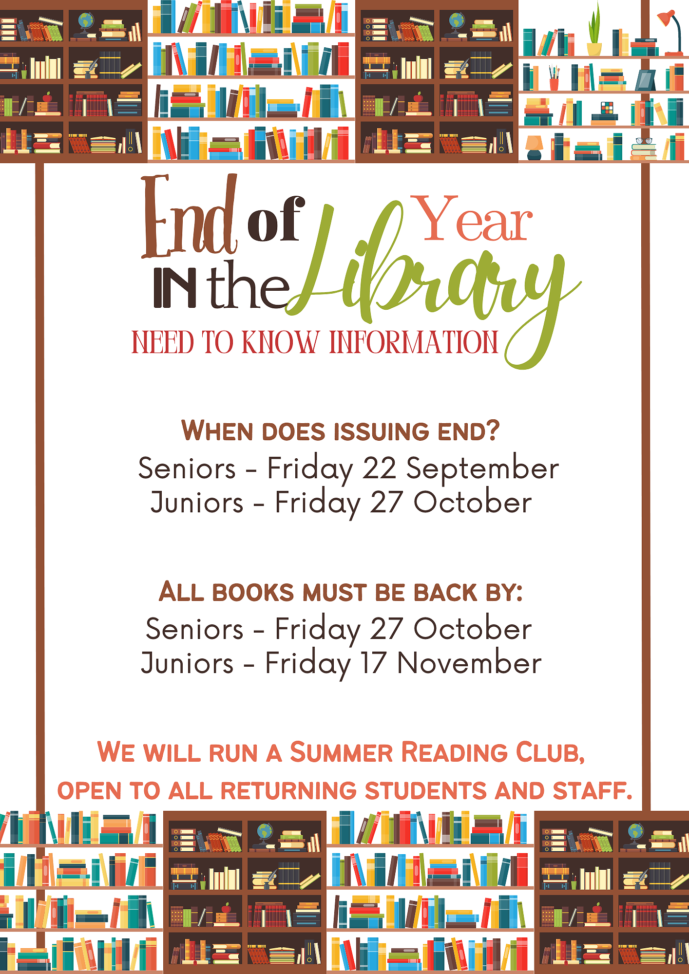 Speaking of books coming back. This, the last week of term three, was the last week for seniors (Years 11, 12 and 13) to issue books and all books MUST be returned by 27 October. Juniors (years 9 and 10) have until 27 October, and all books MUST be returned by 17 November. These dates are crucial for our stocktaking.