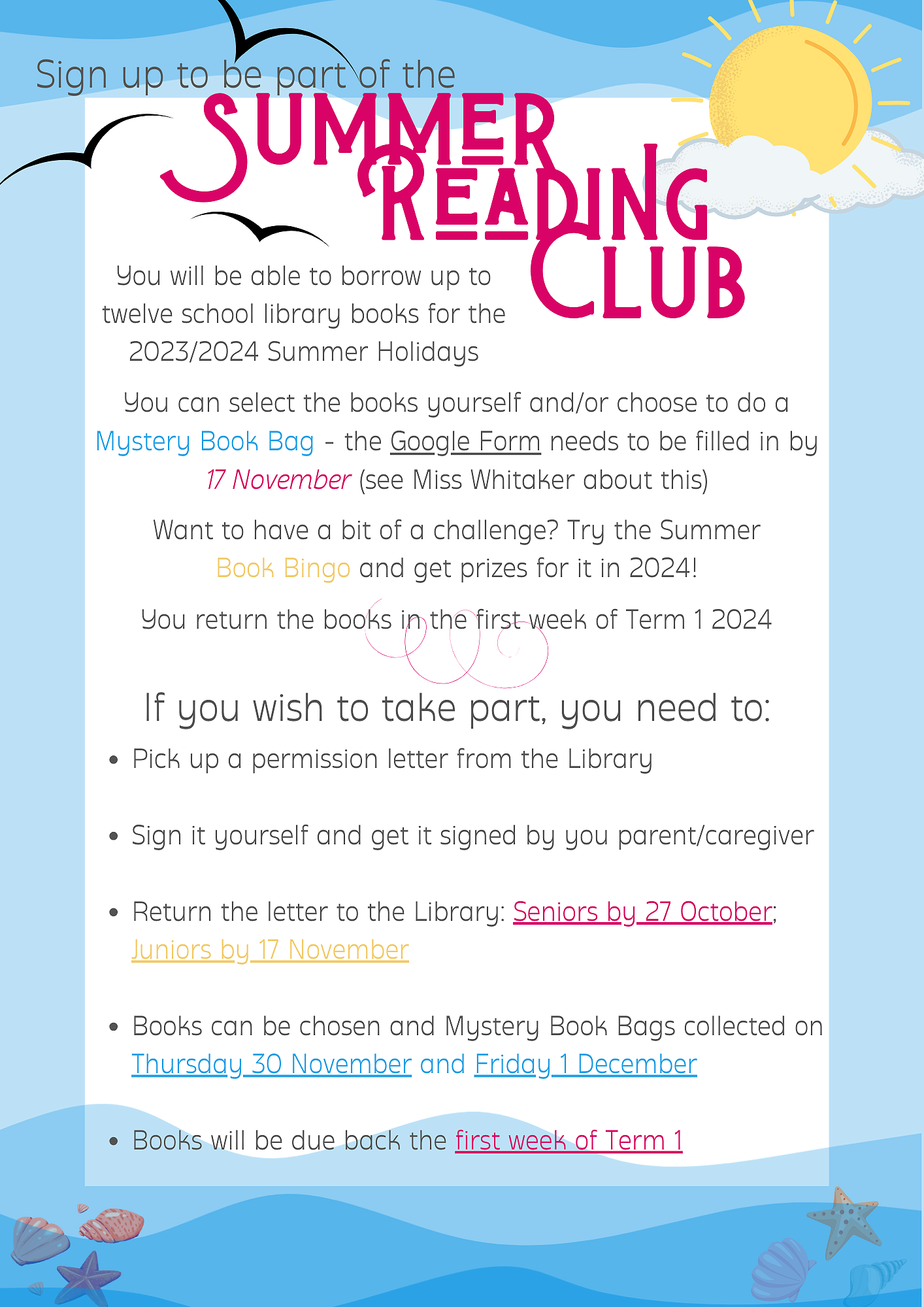 With the summer holidays coming up, we are preparing our Summer Reading Club. Anyone returning next year can be a part of it. We have some fun things happening, like Mystery Book Bags (the librarians pick 4-5 books we think you will like and put them in a bag) and Summer Book Bingo! Your young person can be a part of it, they just need to collect a permission form from the Library and return it to the library - Seniors by 27 October and Juniors by 17 November.