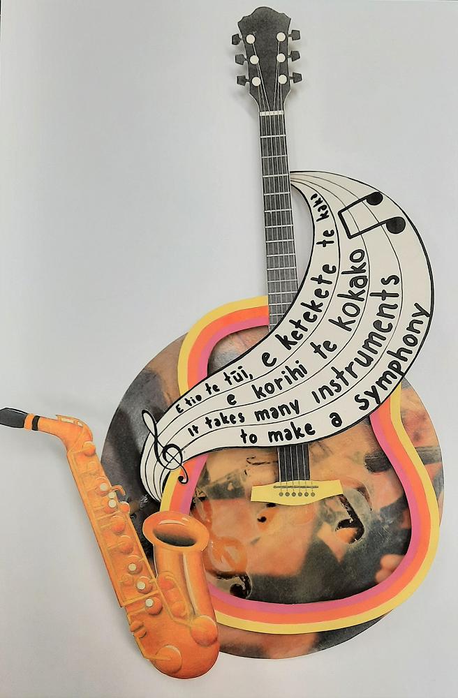 I made a diorama based on my whakataukīof choice: “E tio te tui, E ketekete te kaka, E korihi te kokako” - It takes many instruments to make a symphony. I chose this whakataukī because I love music. Each layer represents a different aspect of music. The first layer is violinists, made with stencils and coated with a brown varnish. The second is a painted guitar. The third layer is sheet music with my whakataukī written on it. The last is a detailed saxophone painting. The 3D effect was created using straws and hot glue.