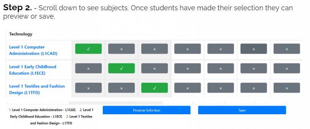Step 2. - Scroll down to see subjects. Once students have made their selection they can preview or save.