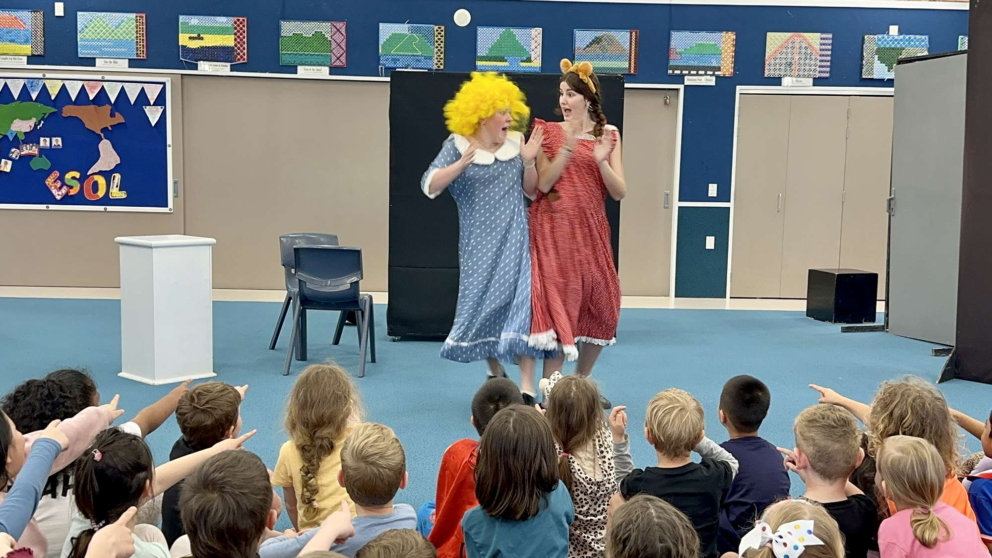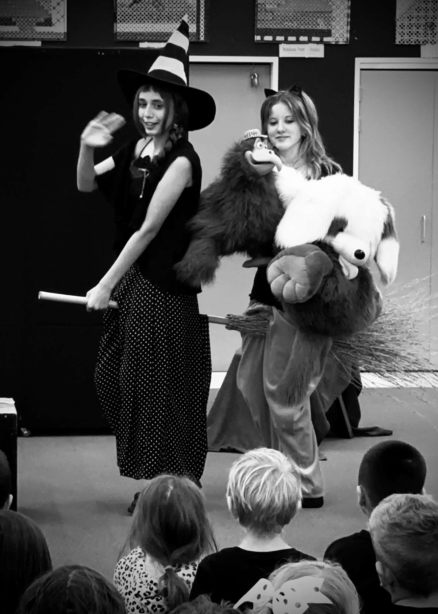 New entrance students, Year 1 & 2s, were wowed with puppets, chase scenes, flying broomsticks and more. They loved the moments with audience involvement, yelling out helpful things like, ‘She’s behind you!’, singing the gingerbread theme song with gusto, and one little Spiderman even got to jump up and scare away a dragon!