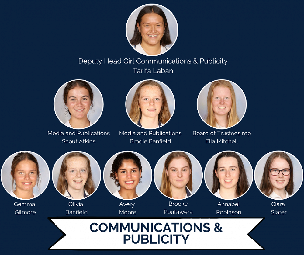 - Communications and Publicity - Gemma Gilmore, Olivia Banfield, Avery Moore, Brooke Poutawera, Annabel Robinson and Ciara Slater