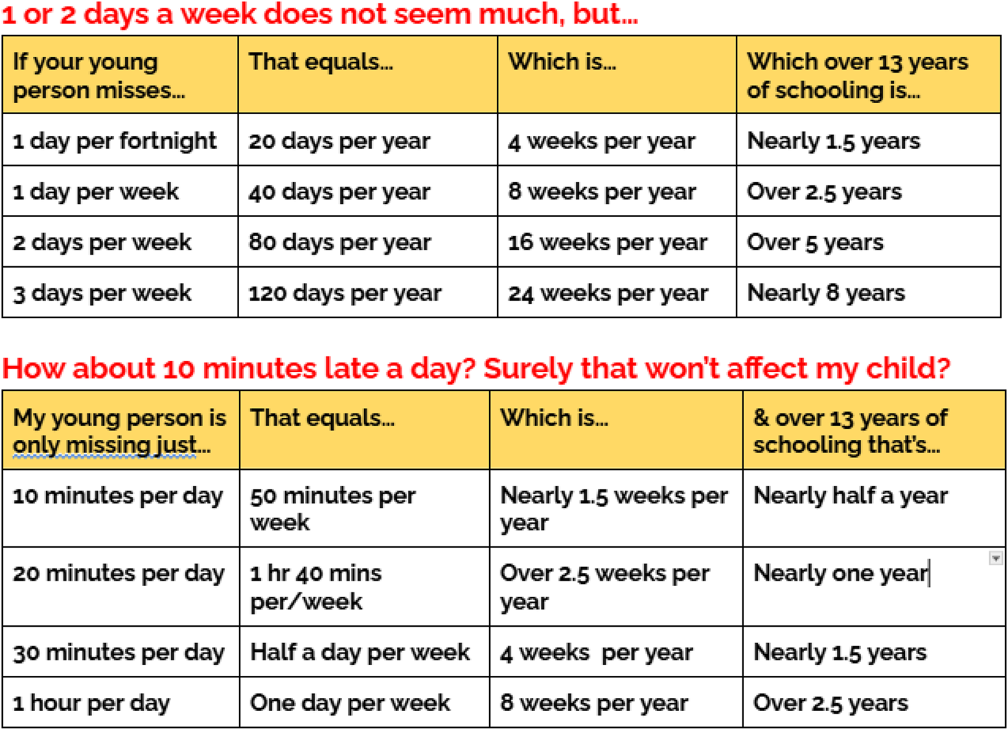 The Ministry of Education encourages all young people to attend school regularly. The table below highlights how much school is missed when absent on a regular basis. It also highlights the impact of lateness.