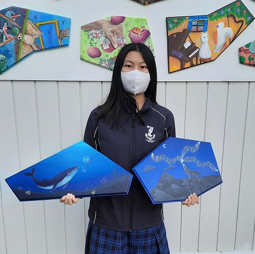 I came from Hong Kong to New Zealand this year. This is the first time that I have painted. Before coming to TGC I always thought painting was impossible for me to do so I never gave it a try, but after I did my mural, I realised it wasn't as hard as I thought it would be and I had a lot of fun while I was painting. My ideas came from feeling peaceful and relaxed when looking at the sky at night and diving underwater. I have learnt a lot of painting skills and I hope I can improve more in my next painting.