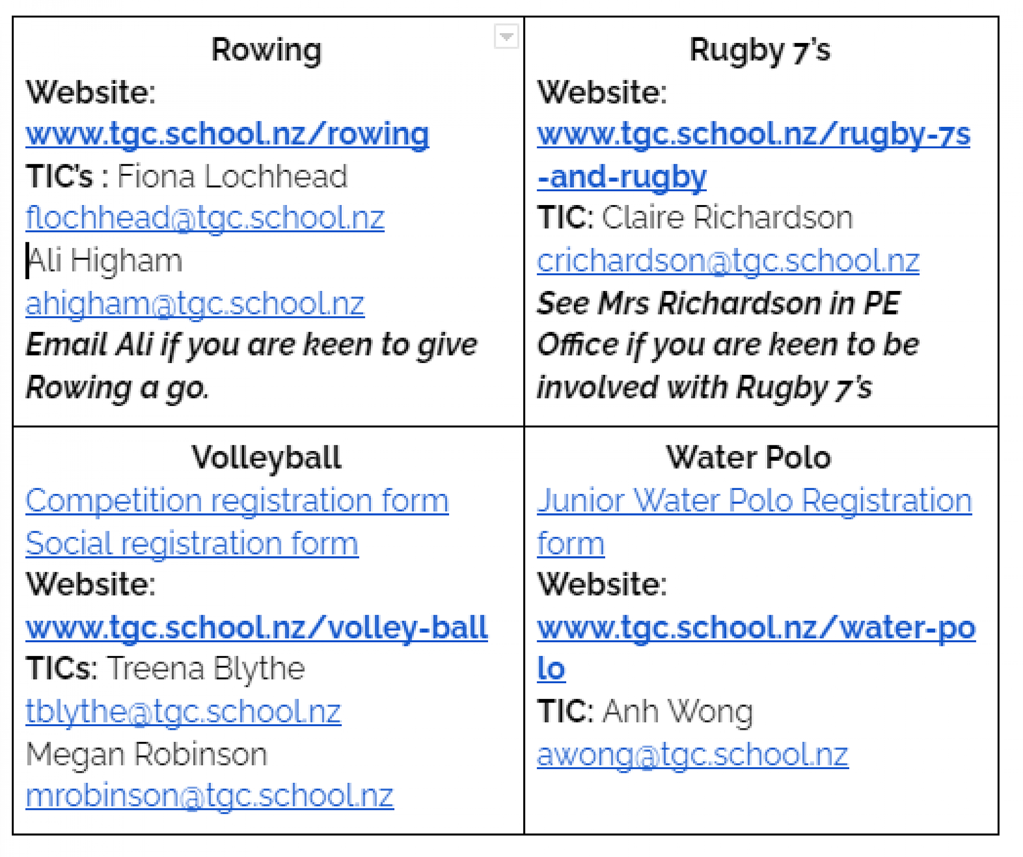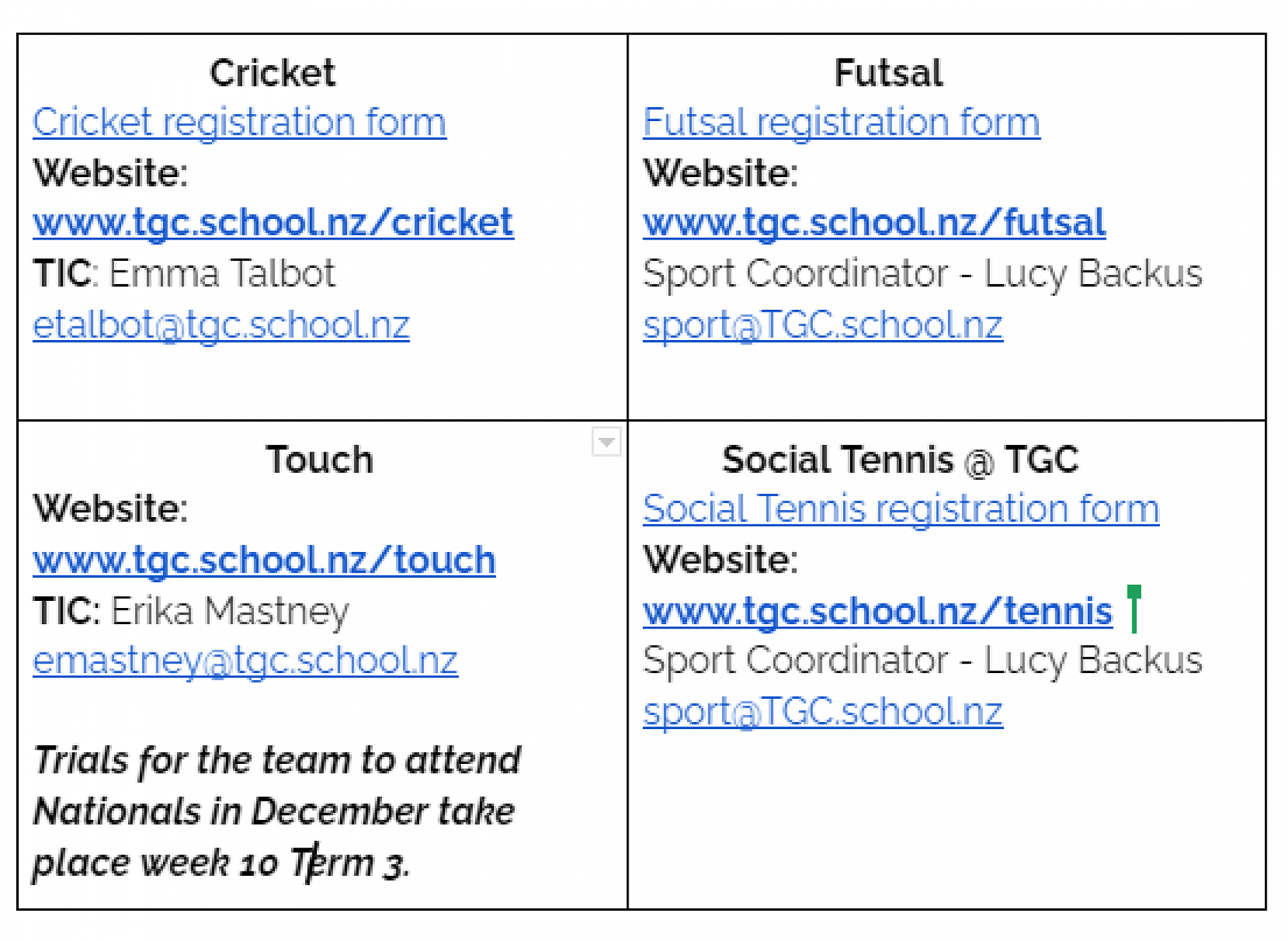 Trial dates and season information will be on the google form and also on the school website www.tgc.school.nz/sport