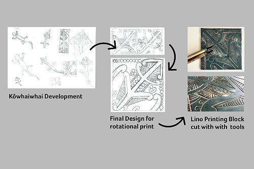 This is my kōwhaiwhai print, which I created in Ngā Toi Māori. Our mahi toi is inspired by the works of ringa toi (artists) Tracy Tawhiao and Sandy Adsett.
