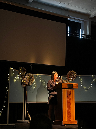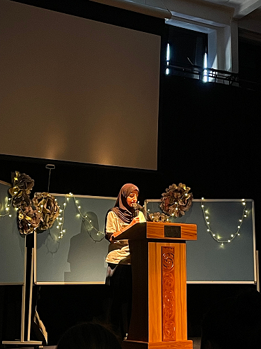 The Arts Prefect team created a stunning display combining newspaper flowers and fairy lights, yet however stunning the backdrop, the poets still took all the focus. The lights went off and the powerful, moody atmosphere took over. Topics ranged from climate change to personality to Russian space dogs, and big ideas outshone the small forum.