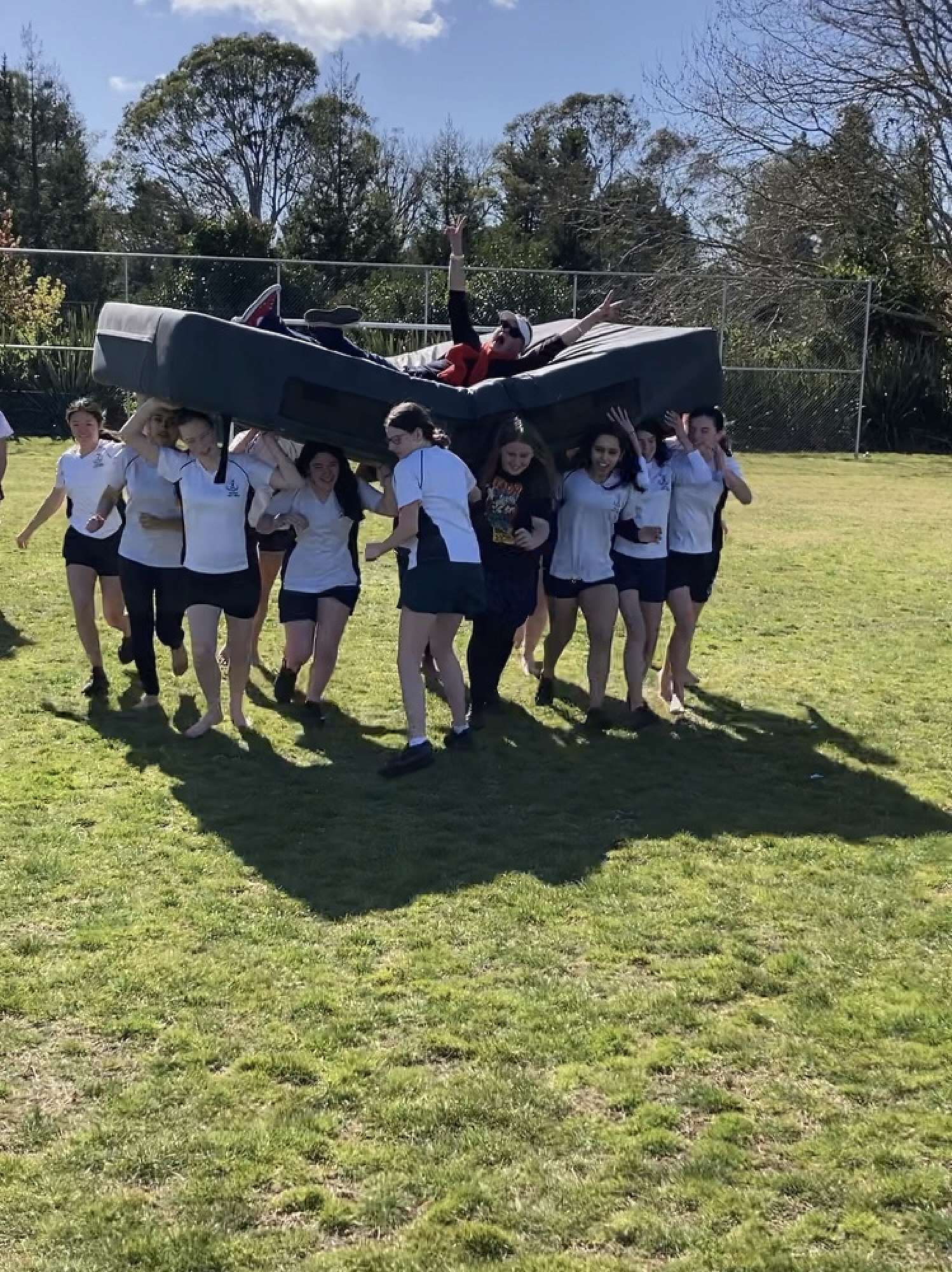 The wonderful 10FIN students decided to have an army-style lesson. This involved two teams racing to carry each member on top of a fat mat. At one stage, they kidnapped their teacher and shot off across the field with her screaming and laughing until she was thrown unceremoniously to the ground!