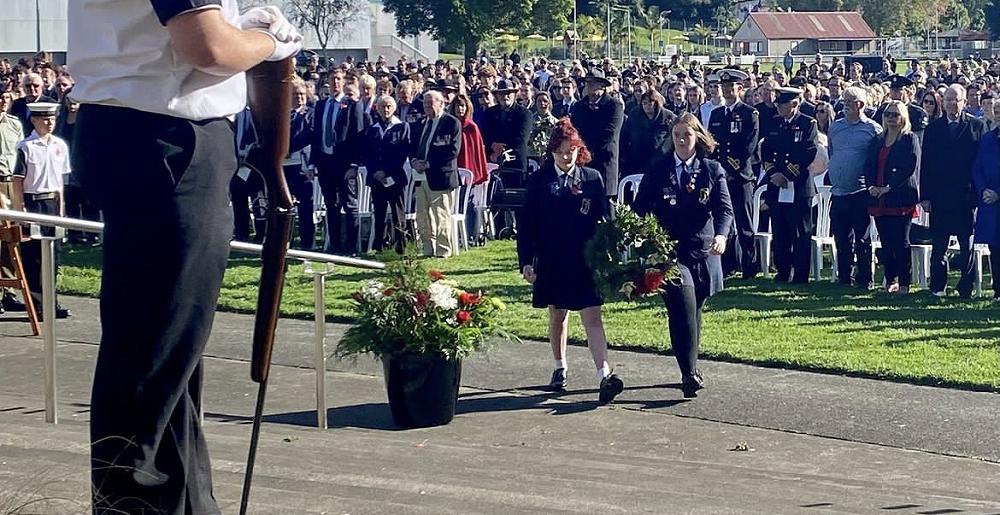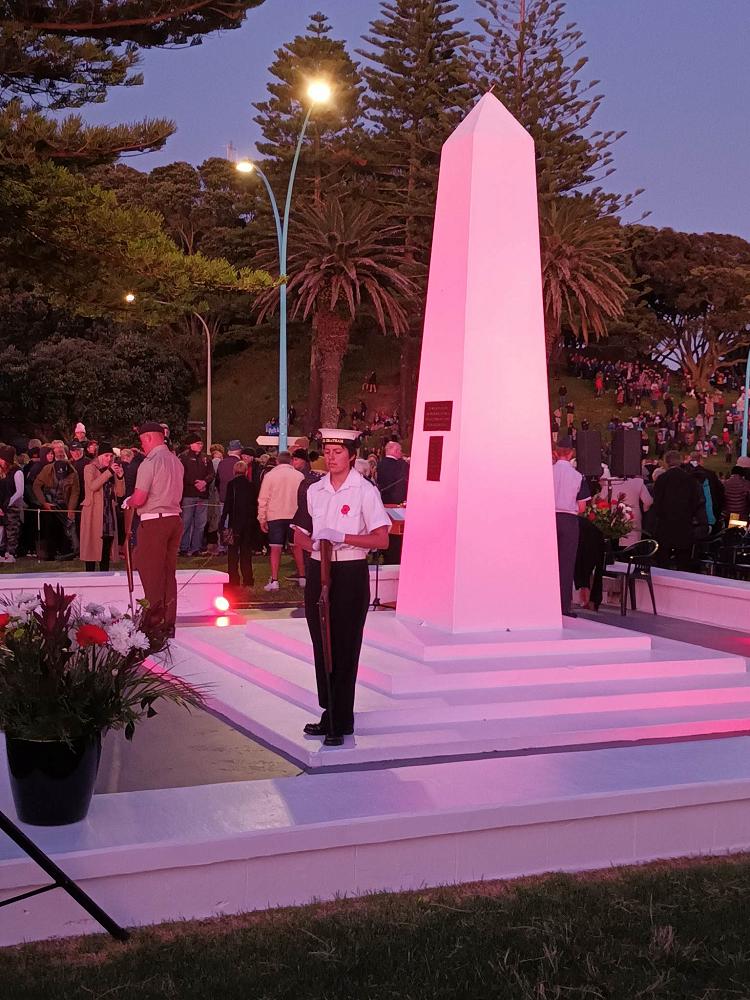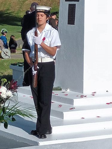 At the same time, on the other side of Tauranga, Able Navy Cadet Loui Mejia-Ball, a Year 12 student at Tauranga Girls' College, attended the Mount Maunganui Dawn service in her role guarding the memorial cenotaph.